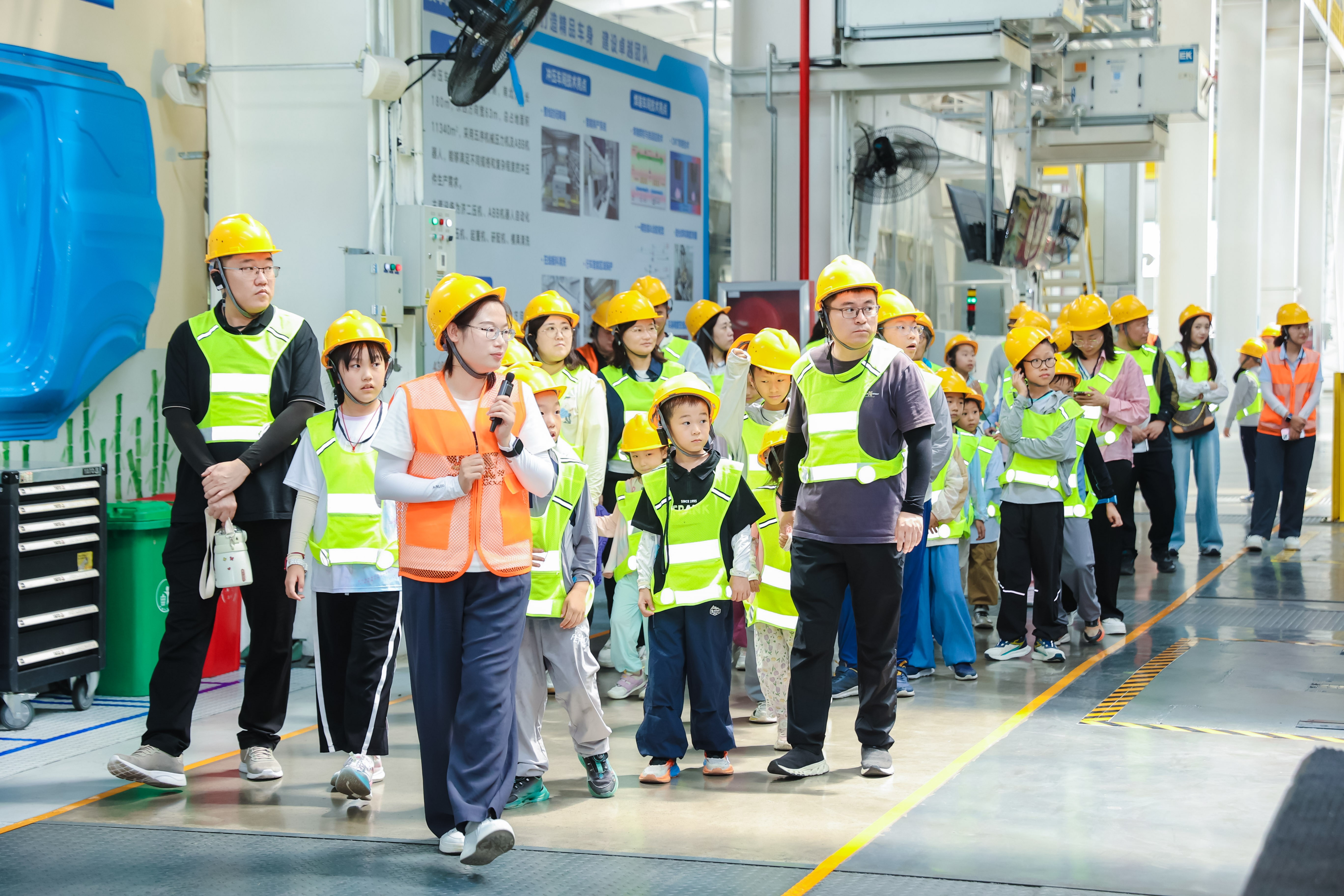 午后,孩子們穿戴上安全帽,化身“小小工程師”走進(jìn)生產(chǎn)車間。沖壓車間里,巨型機(jī)械臂精準(zhǔn)沖壓鋼板的震撼場(chǎng)景,讓孩子們直觀感受工業(yè)力量;焊接車間內(nèi),上百臺(tái)機(jī)器人以毫米級(jí)精度協(xié)同作業(yè),靈活的機(jī)械臂舞動(dòng)間,車身框架逐漸成型,智能化生產(chǎn)線的高效運(yùn)轉(zhuǎn)令大家贊嘆不已;總裝車間的流水線上,零部件如同被施了魔法般有序組裝,最終化為一輛輛嶄新的汽車,讓孩子們親眼見(jiàn)證“鋼鐵如何變汽車”的奇跡。